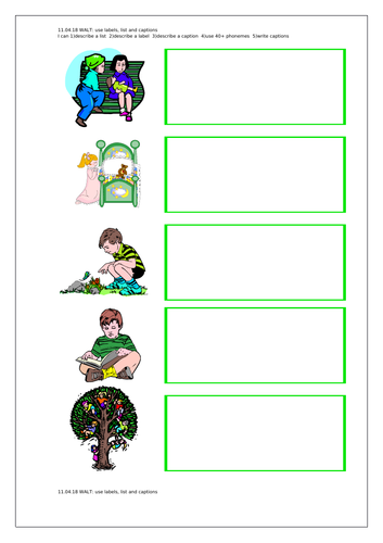 4,271 Top "Labels And Captions Year 1 Powerpoint" Teaching Resources ... 4,271 Top "Labels And Captions Year 1 Powerpoint" Teaching Resources curated for you. Park Label the Picture Worksheet . 5.0 (4 reviews) Last downloaded on. Phase 2 ... plan it labels what is a caption . What Is a Hurricane? Information PowerPoint. 5.0 (1 review) ... Detailed English plan - Year 1 - Lists, labels, captions - Autumn The plan has been carefully crafted to allow children a smooth transition from foundation stage to year 1, ensuring that early knowledge of reading and writing is built upon in a well-supported and structured way. The plan reflects the heightened expectations of curriculum 2014, and incorporates a greater focus on sentence structure. Labels, lists and captions - Bells Farm Primary School Wednesday 8 October 2014. This week we are looking at how to write labels, lists and captions. Today we wrote captions for the bear pictures, we tried really hard to think about the details we needed to include in our caption (who was in the picture and what they were doing) to give the reader as much information as possible. We started by ...